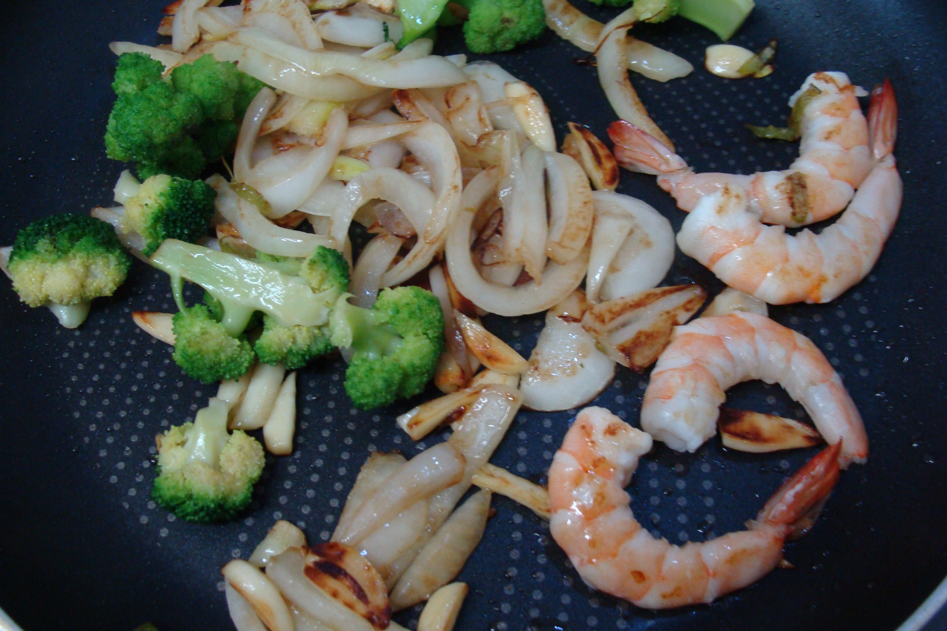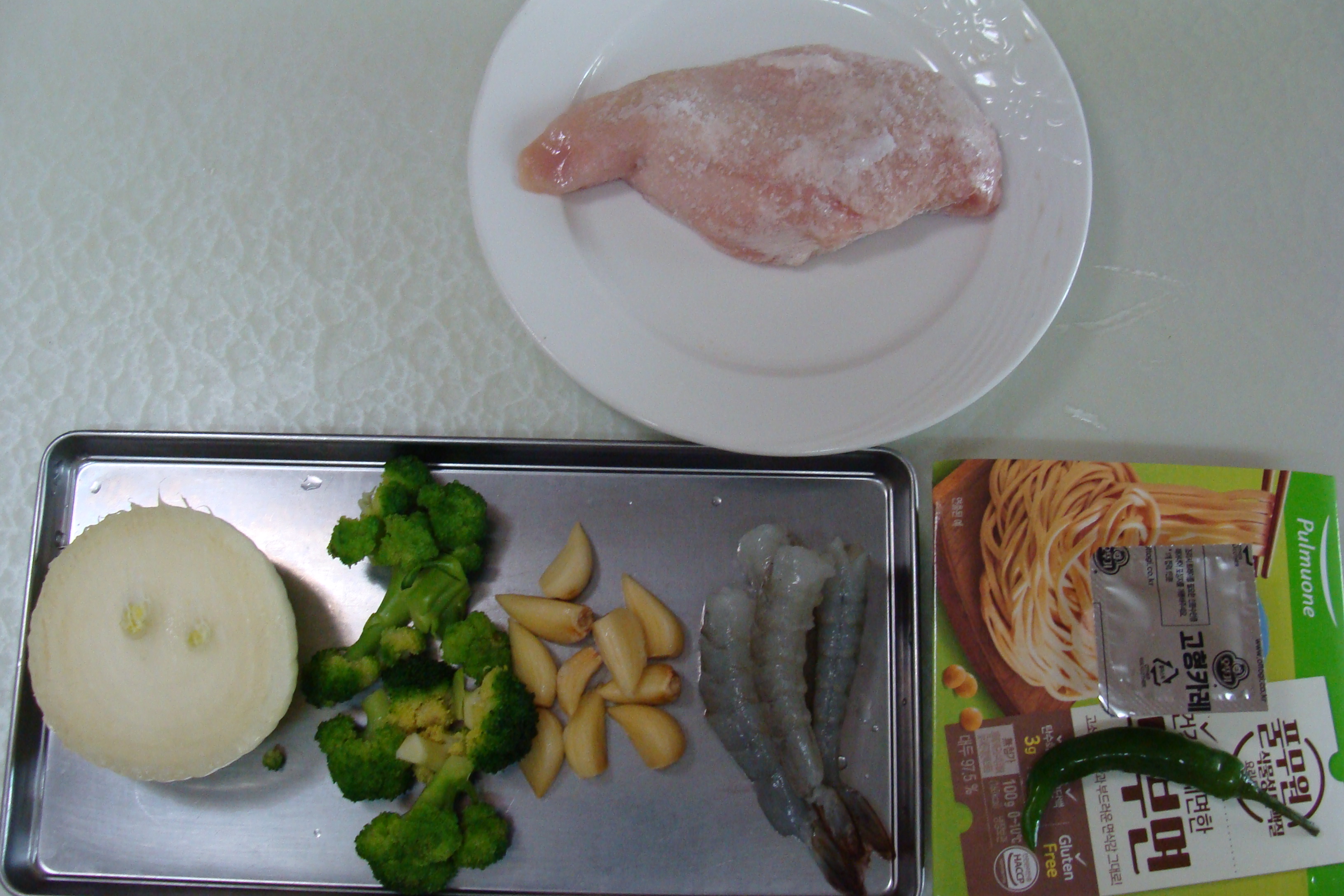 데친 브로콜리와 냉동새우 찬물에 해동하고