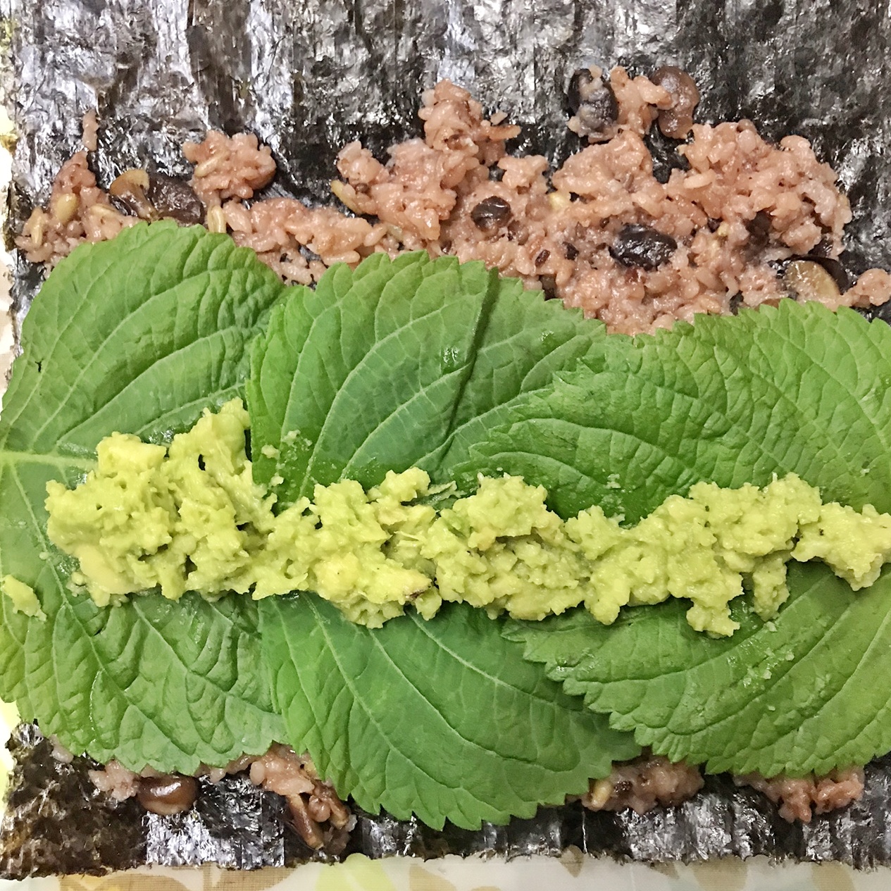 밥 깻잎 아보카도 양배추 크래미 순으로 올려주고 돌돌말아줍니다.
