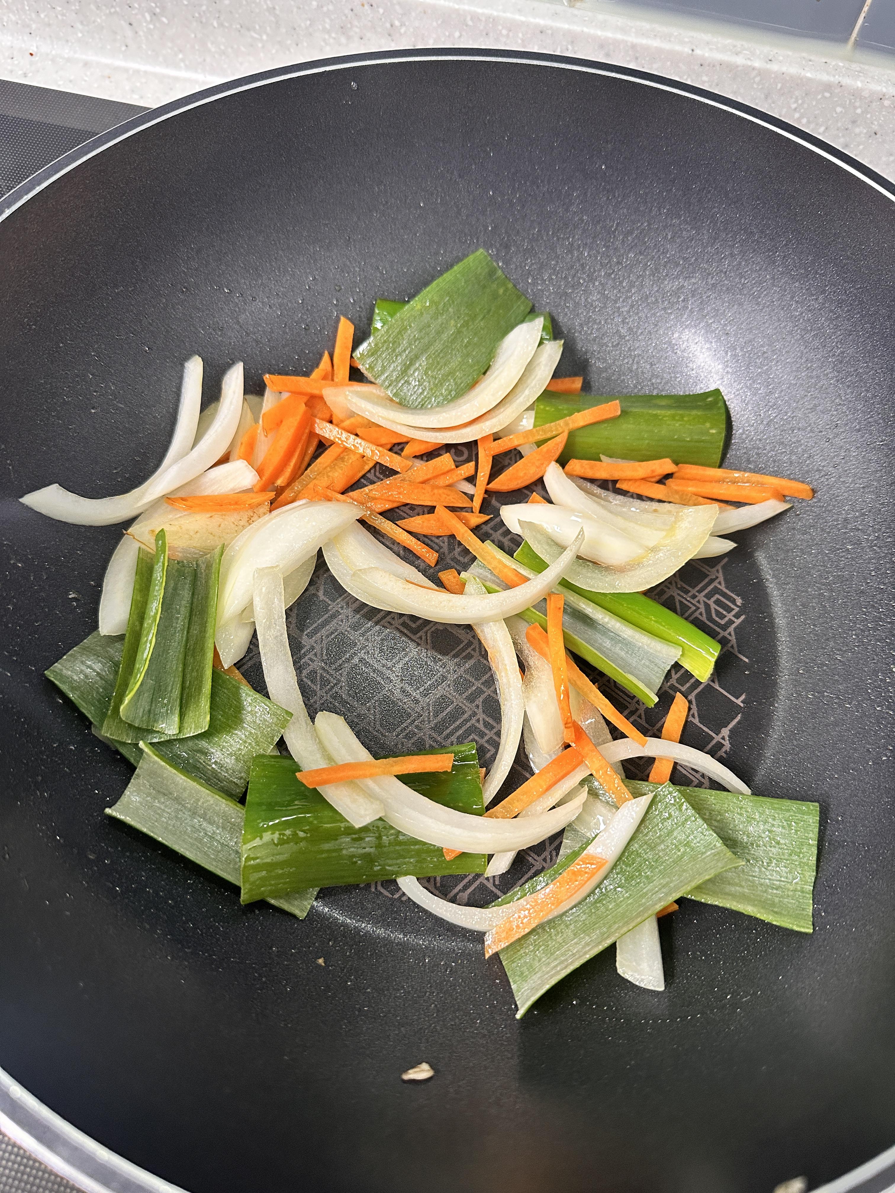 올리브유 두른 팬에 당근, 양파, 파 먼저 볶아주고